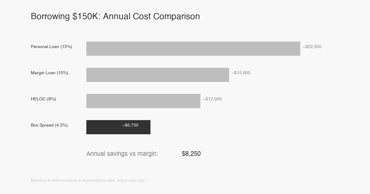 - Borrow at Institutional Rates: Box spreads eliminate the markup associated with margin loans, potentially saving you thousands annually.